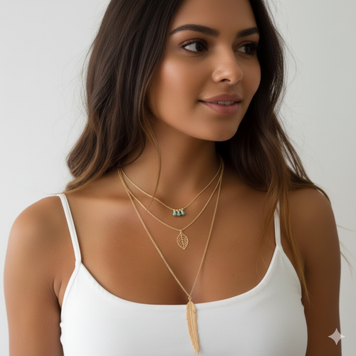 DIXIE | Goldfarbene Halskette mit Feder und Blatt Anhängern und süßen kleinen türkise Perlen![]()  - Normaler Preis