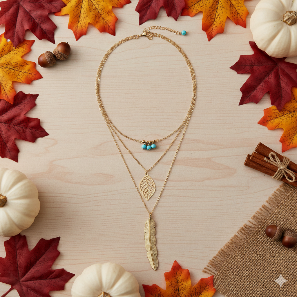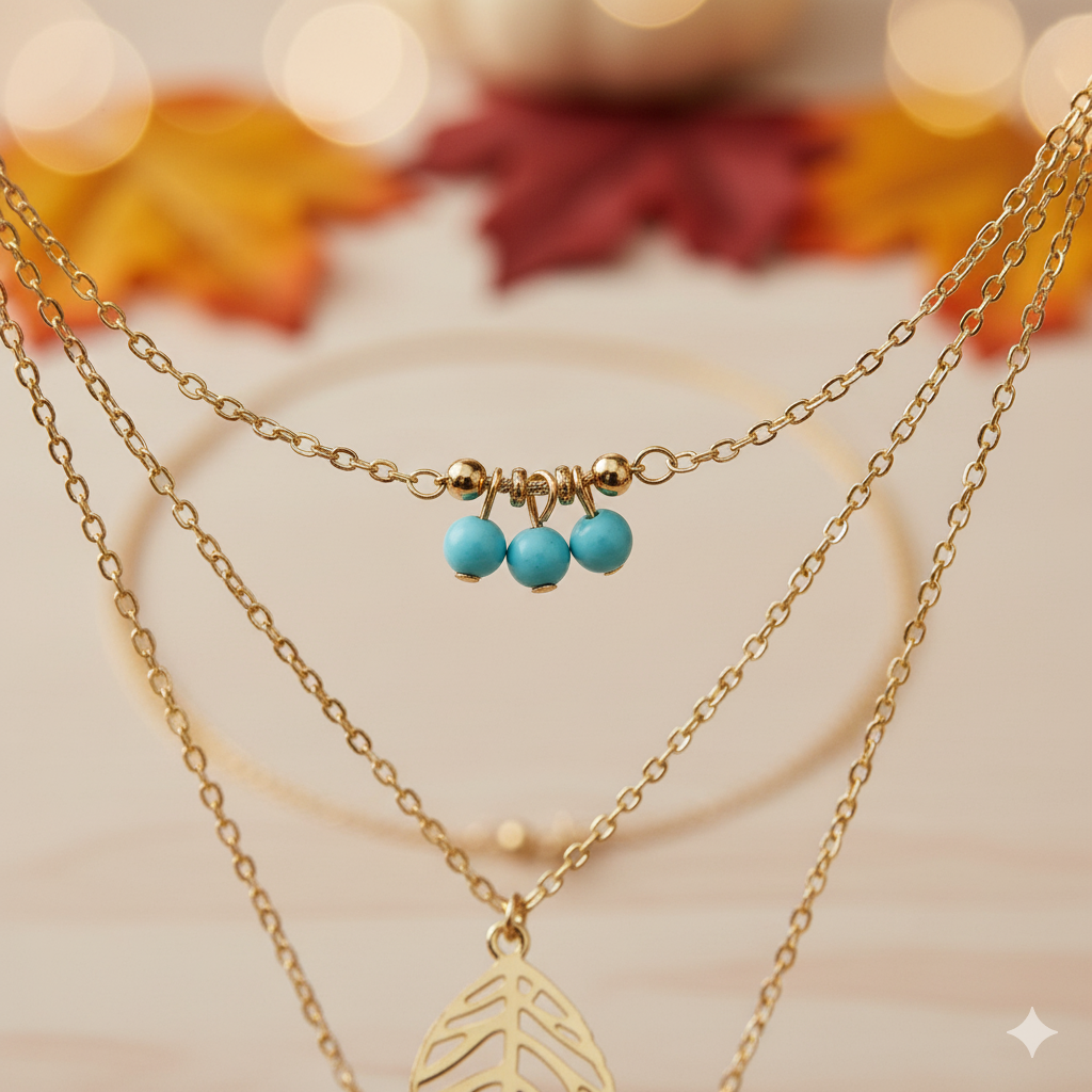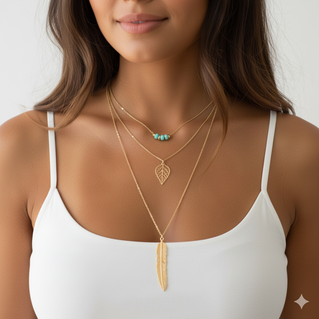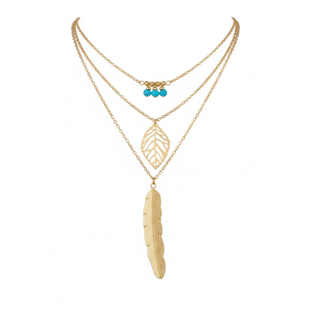 Diese dreilagige Kette bezaubert mit filigranen Feder- und Blattanhängern, die sanft im Licht schimmern, während kleine türkise Perlen frische Farbakzente setzen und an endlose Sommertage erinnern. Das goldfarbene Finish verleiht ihr einen edlen, femininen Look, der sich mühelos zu jedem Outfit kombinieren lässt – ob zu einem fließenden Kleid, einem schlichten T-Shirt oder einem eleganten Abendstyle.