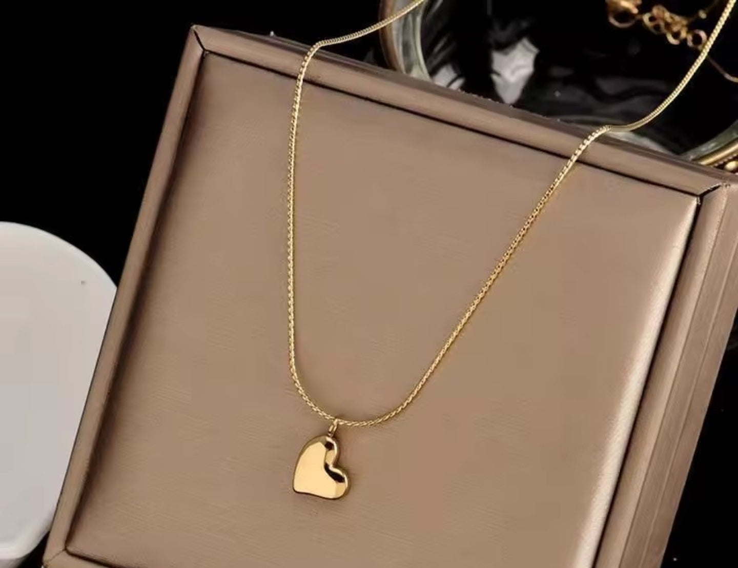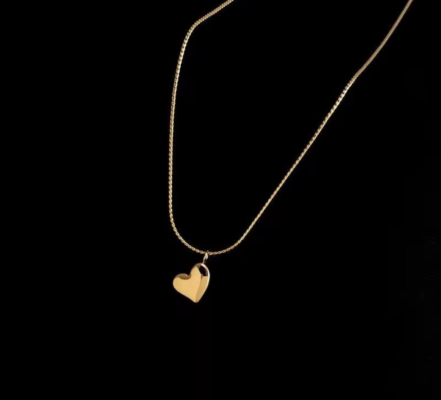 Die feine, goldfarbene Kette trägt einen sanft geschwungenen Herz-Anhänger – schlicht, elegant und voller Gefühl. Sie schmiegt sich zart an die Haut und fängt das Licht auf eine Weise ein, die Wärme und Zärtlichkeit ausstrahlt.