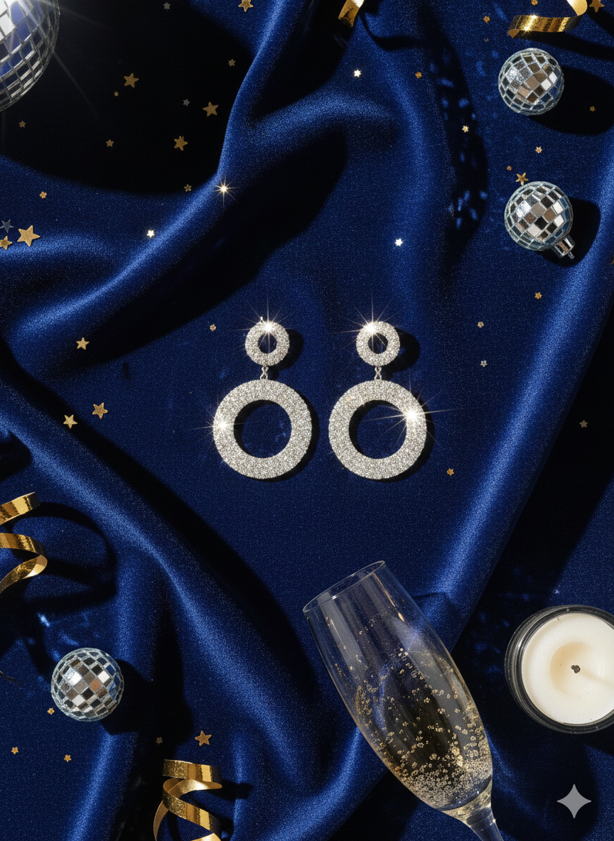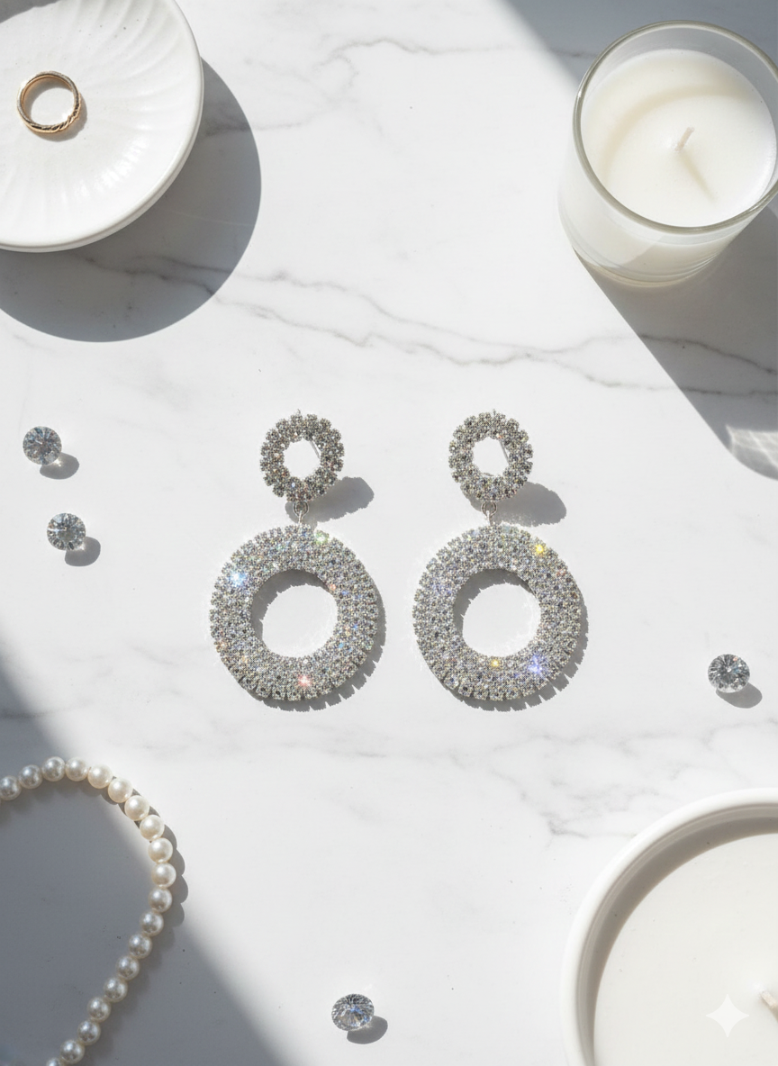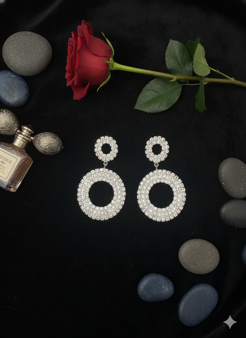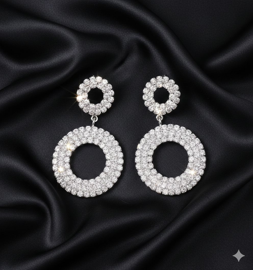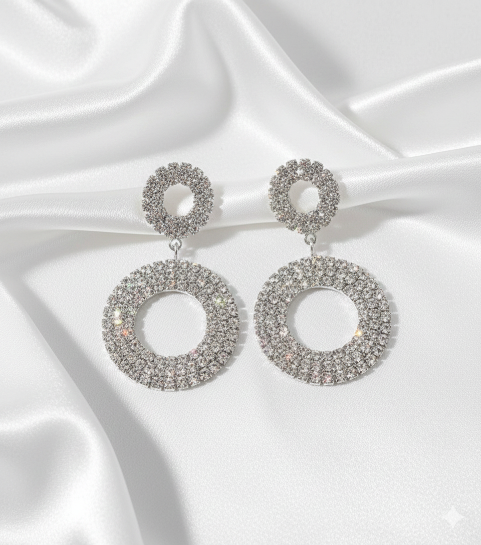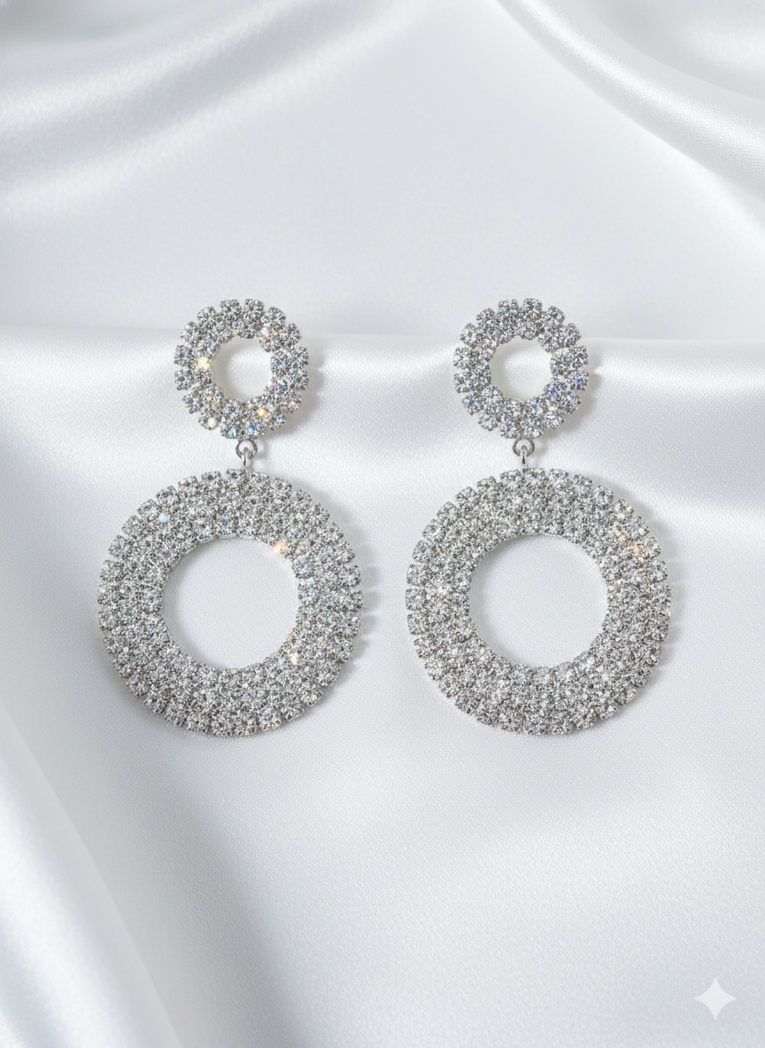 Setze ein glamouröses Statement mit den ÉLODIE Statement-Ohrringen. Die funkelnden, kreisförmigen Elemente sind vollständig mit klaren Kristallen besetzt und schimmern in edlem silber bei jeder Bewegung. Das doppelte Ringdesign sorgt für einen modernen, luxuriösen Look – perfekt für Partys, Hochzeiten, Galas oder elegante Abendveranstaltungen.