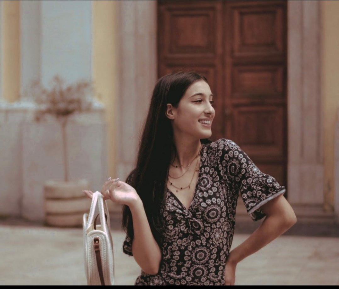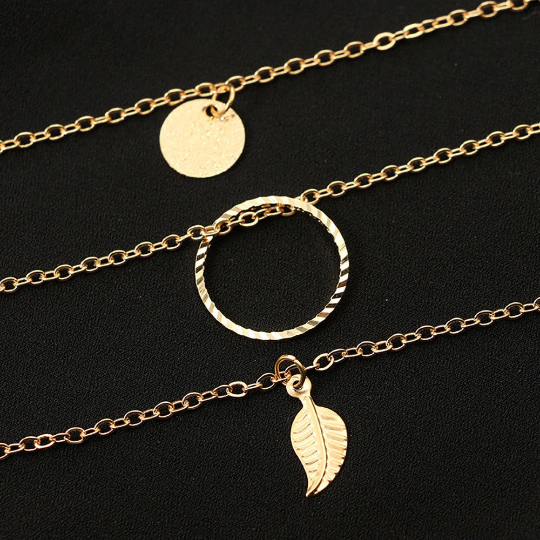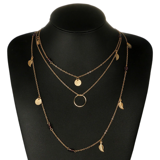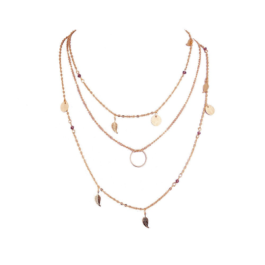 ARIANA | Mehrlagige goldene Halskette mit Blättern Münze und kleinen lila Kristall