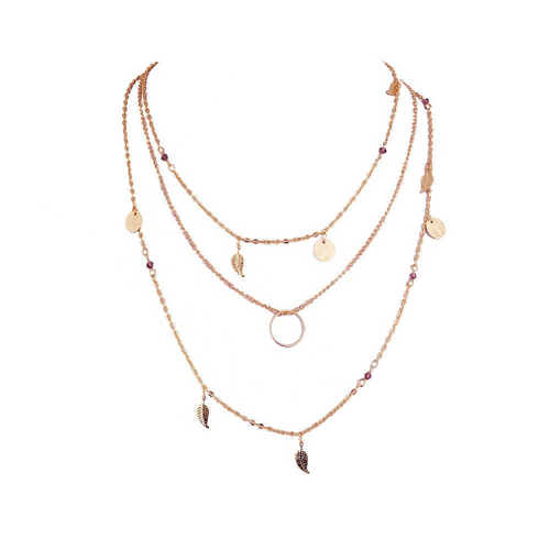 ARIANA | Mehrlagige goldene Halskette mit Blättern Münze und kleinen lila Kristall