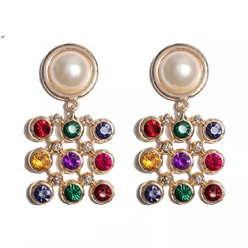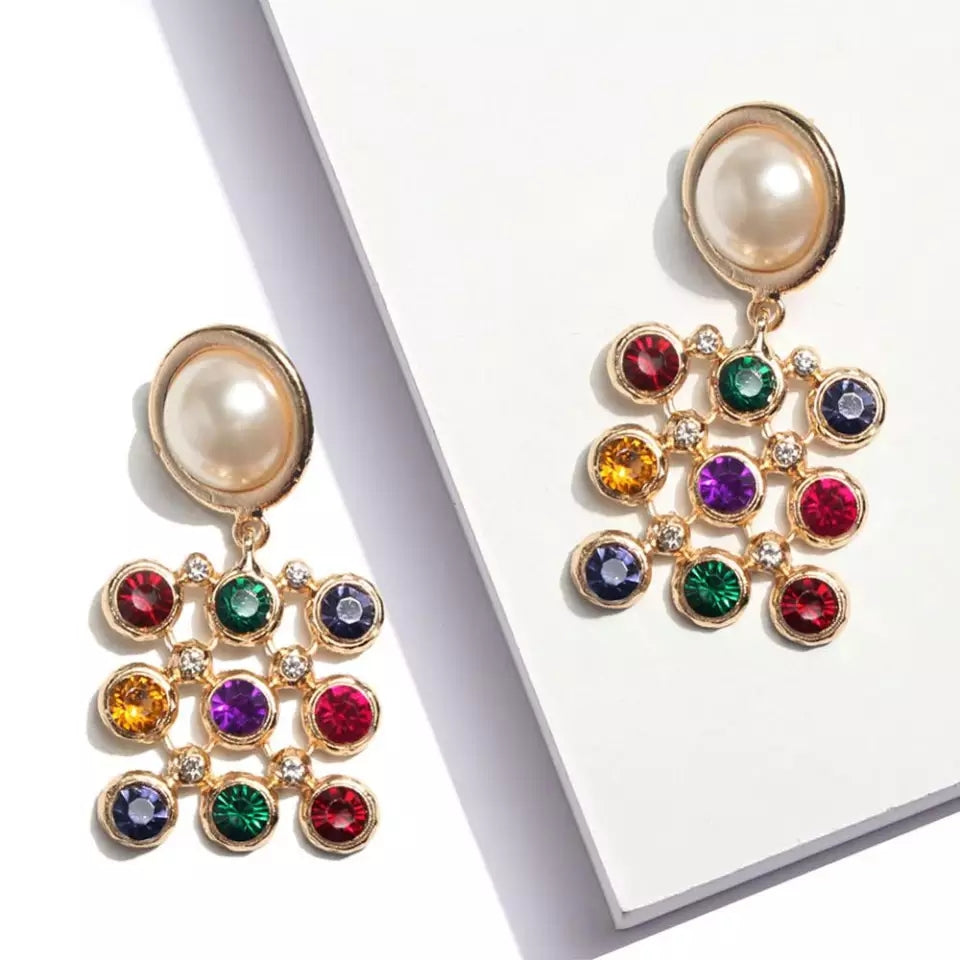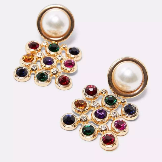 NOVALIE | Edle goldfarbene Party Statement Ohrringe mit crémeweißen Perlen und bunten Kristallen