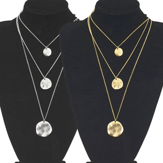 Das Besondere an der süßen Halskette sind die unebenen Coin Anhänger, die verspielt an drei unterschiedlich langen Ketten glänzen.